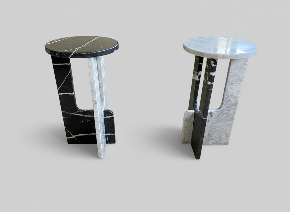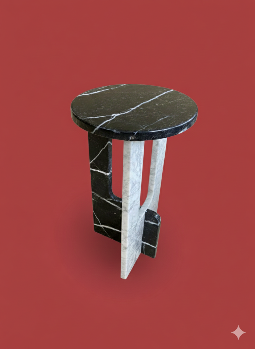 DEUX TABLE D’APPOINT EN MARBRE. UN MELANGE ENTRE MARBRE BLANC CARRARE ET NOIR VEINY.